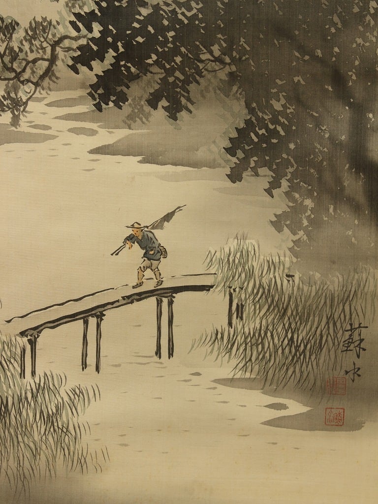 井澤蘇水|IZAWA Sosui( 東京/ 大正-昭和期) 月下帰漁図 半切立物故作家掛軸 春 初夏 夏 盛夏 初秋 年中/普段掛け 縁起物 無事祈願 風俗画 人物画 茶道/寄付き/待合掛 煎茶道 JY2180