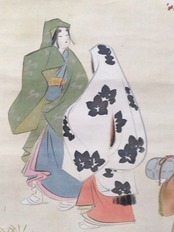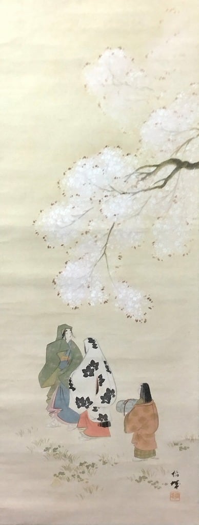 福岡稲城|FUKUOKA Tojo( 愛知/ 1899-?)「桜花見図」土佐派/大和絵 尺五立物故作家掛軸 木箱 春 /普段掛け 歴史画 風俗画 人物画/点心席/立礼席/寄付き/待合掛 香道 日本画 花鳥画 美人画 JY2211