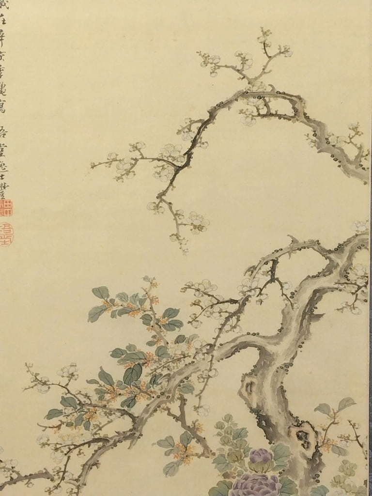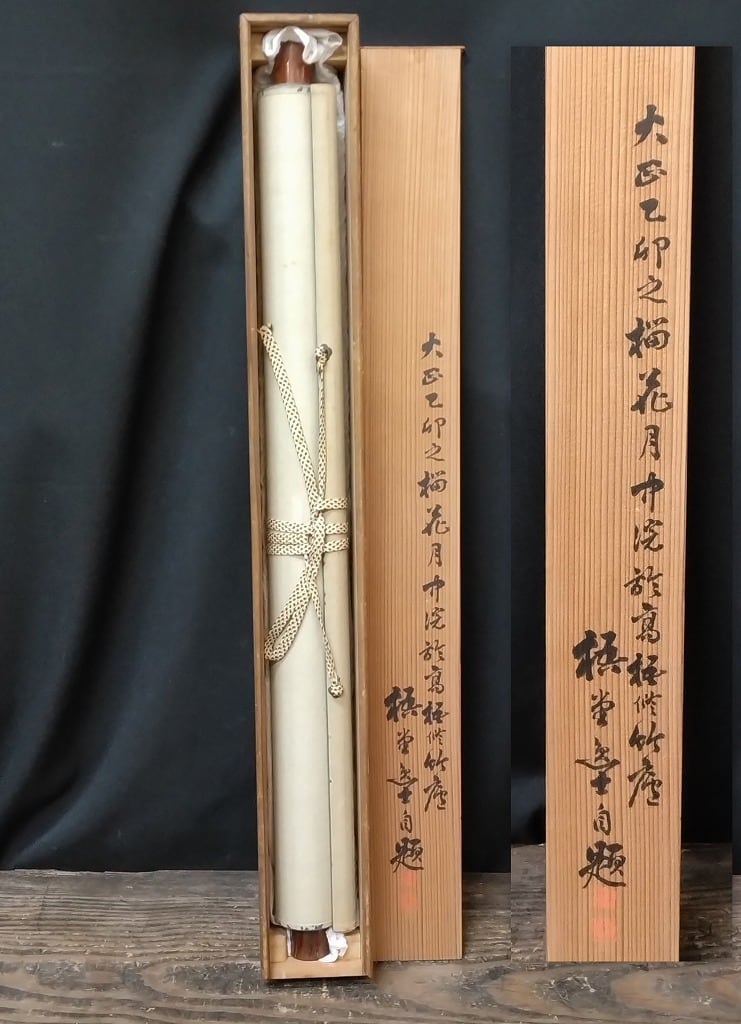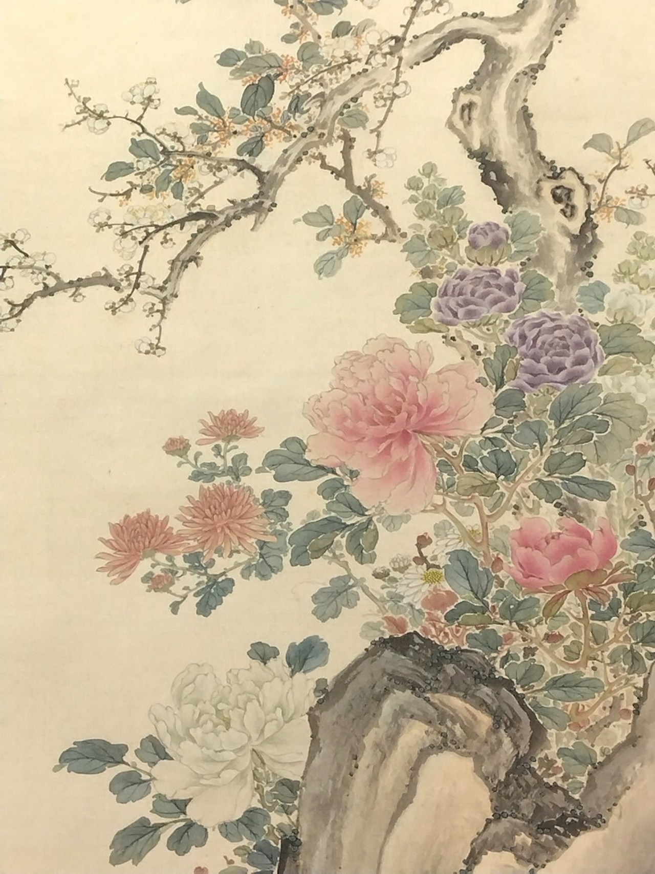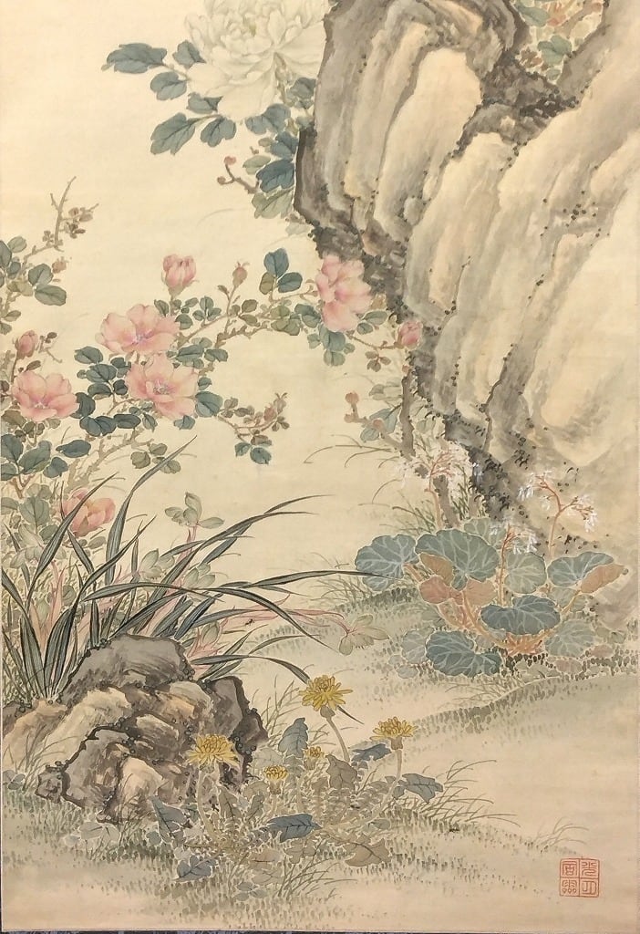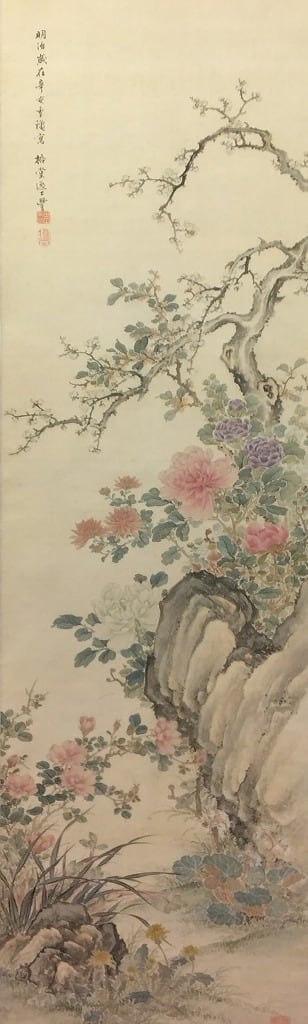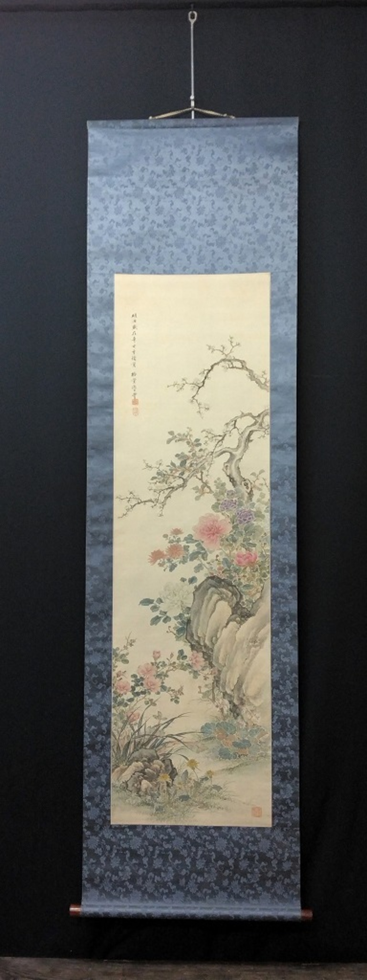 田中梧堂|TANAKA Godo「四時花卉図」(明治辛亥-1911年作) 物故作家掛軸 共箱 正月 めでた掛 年中/普段掛け 茶道具 /寄付き/待合掛 煎茶道 日本画 花鳥画 南画 JY2237
