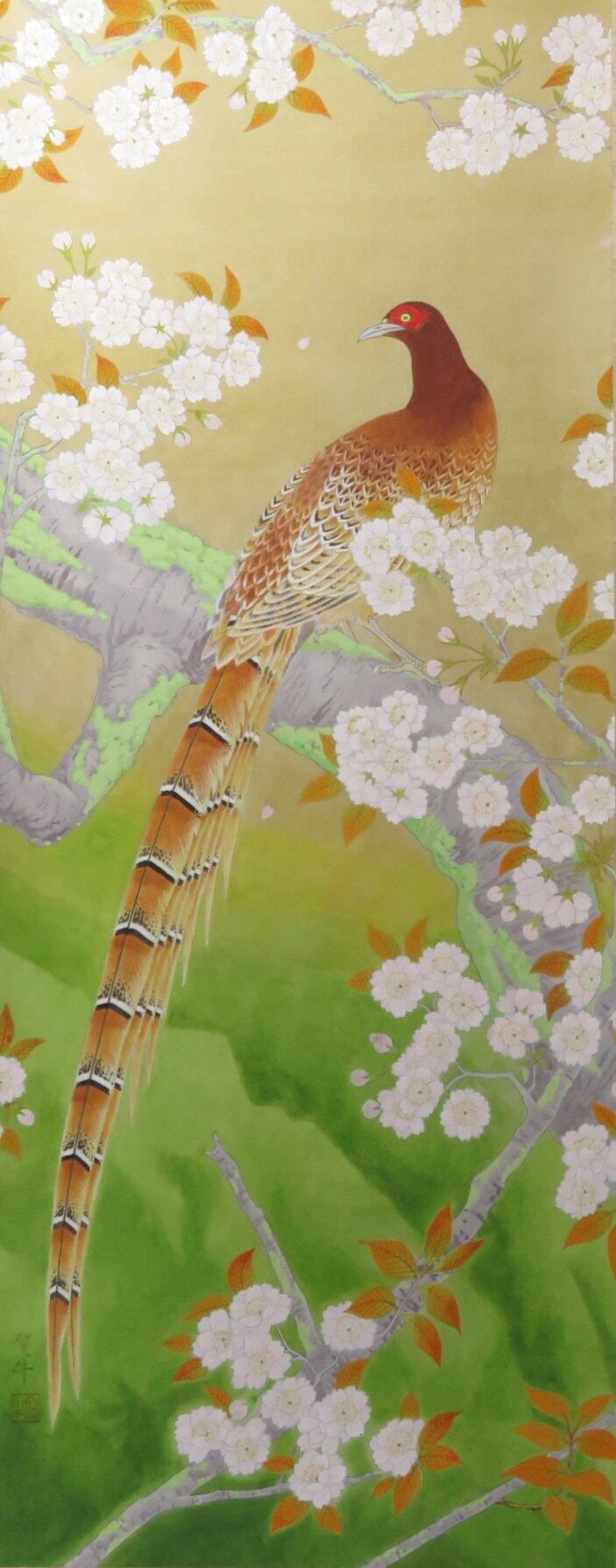 掛軸 前川聖牛 桜に山鳥 尺五立 現代作家新作掛軸 JY1229