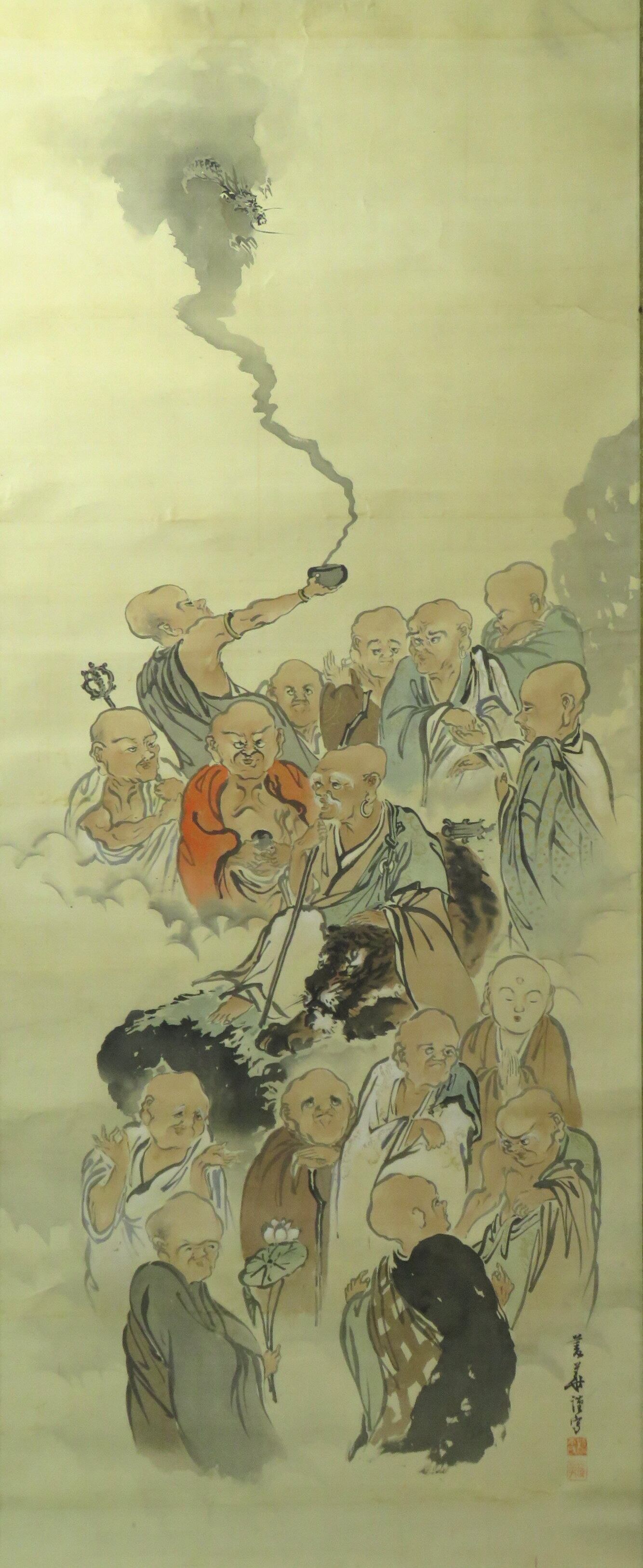 掛軸 橋本菱華 十六羅漢図 尺八立 物故作家掛軸 JY1603