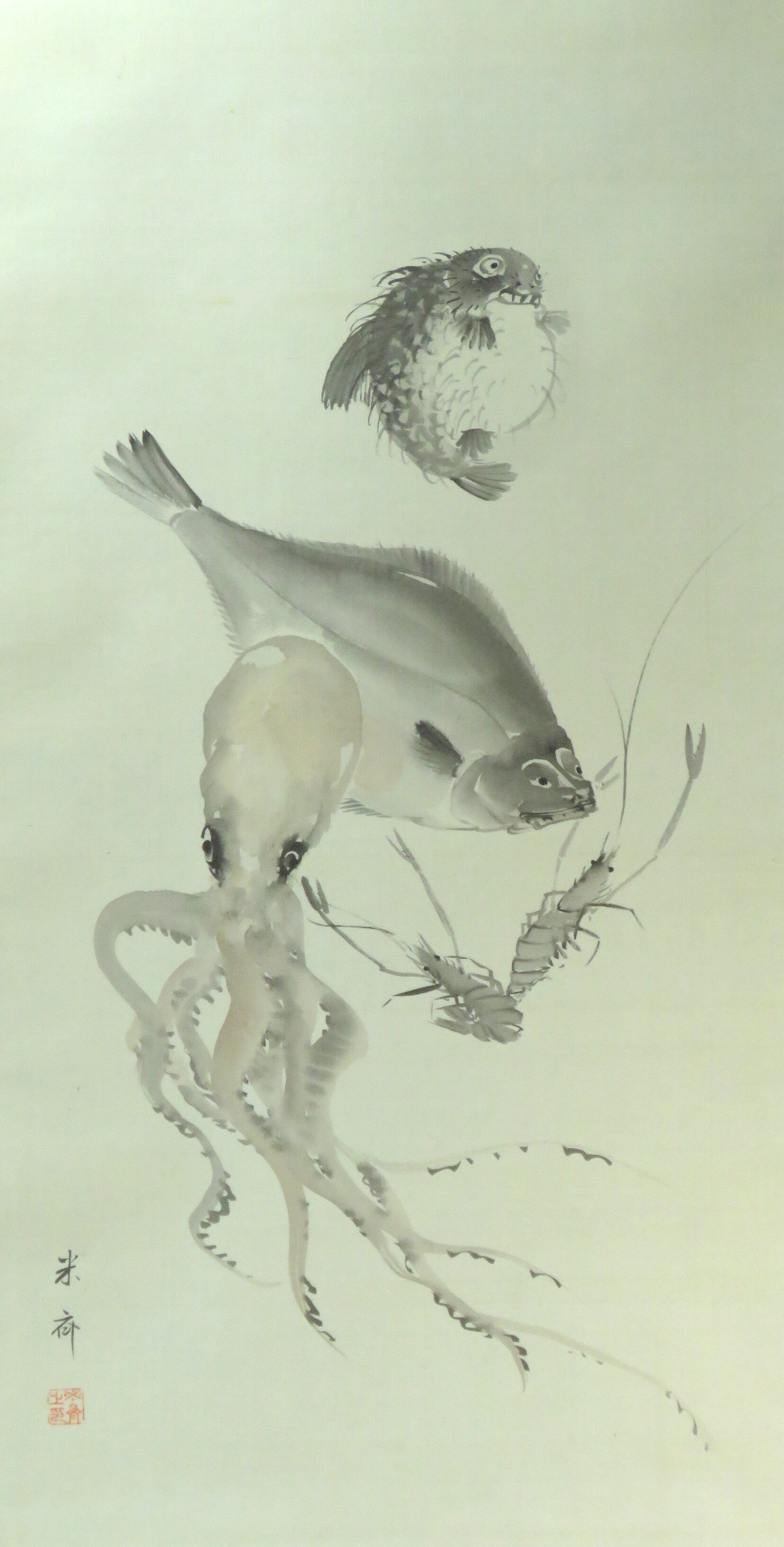 掛軸 久保田米斎 海魚図 尺五立 物故作家掛軸 JY1653