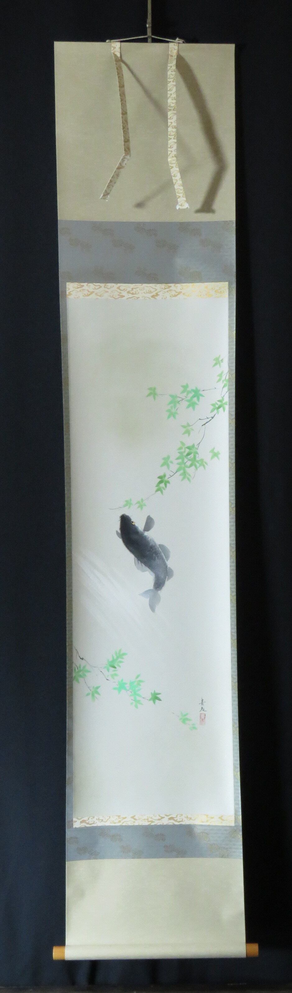 掛軸 辰本青花 跳鯉 共箱 半切立 現代作家新作掛軸 JY1029