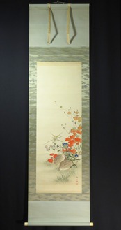 掛軸 渡辺祥益 秋草双鶴図 極箱 尺五立 物故作家掛軸 JY1703-9