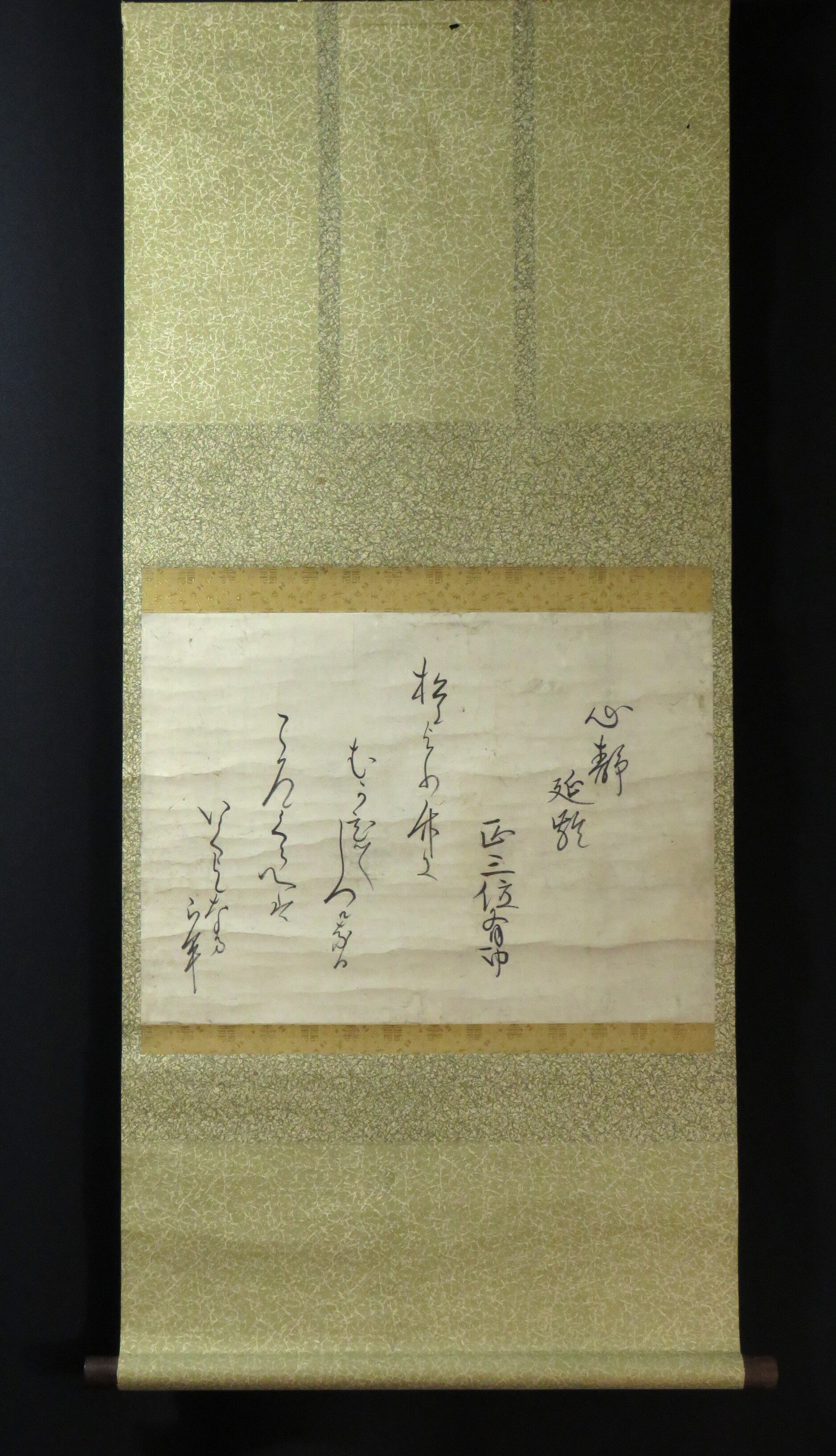 掛軸 千種有功 歌懐紙「心静延離」一文字時代福寿金襴 尺五立 物故作家掛軸 JY577
