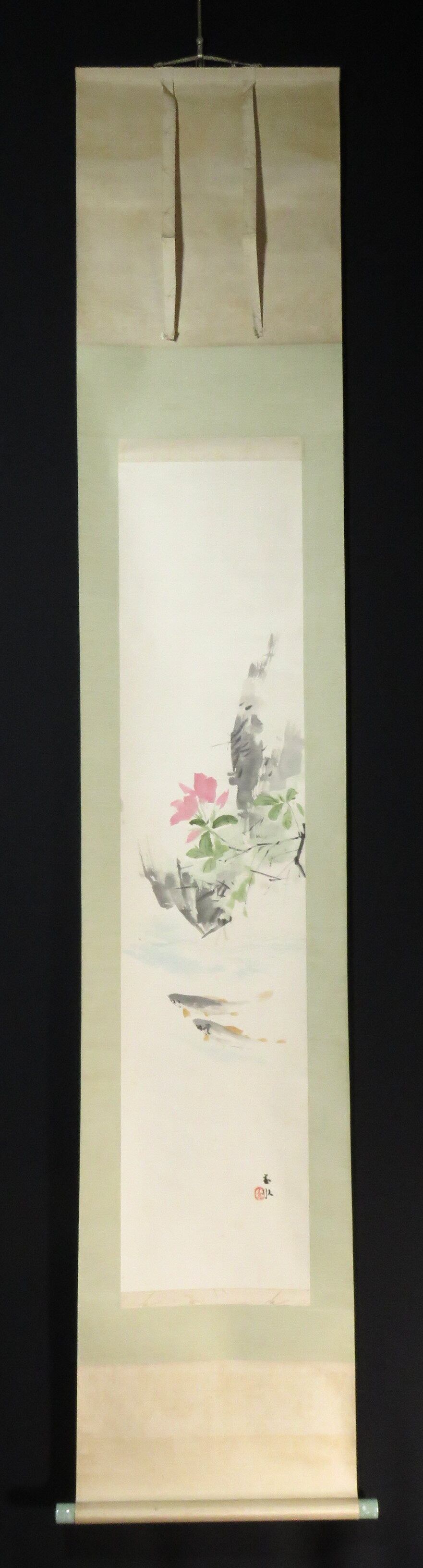 掛軸 須磨対水 水清處 (ツツジに鮎) 尺巾 物故作家掛軸 JY1093
