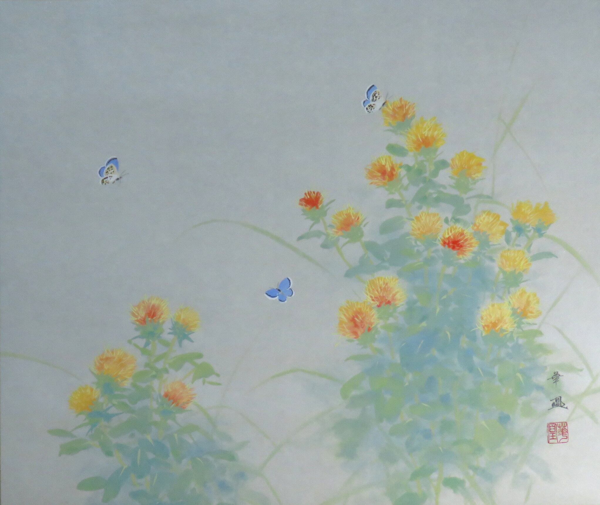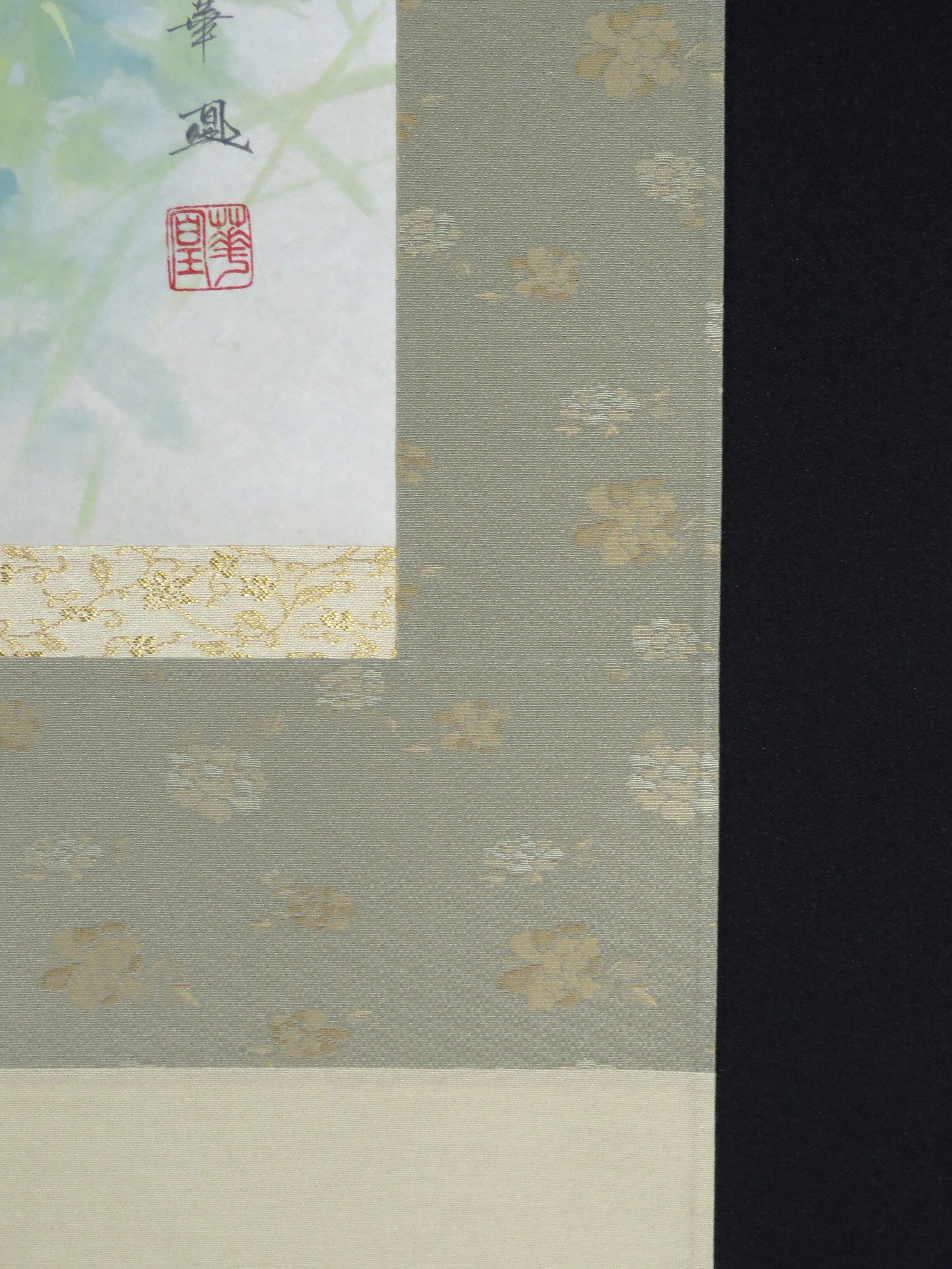 掛軸 出口華凰 「紅花」尺八横 共箱 尺八横 現代作家新作掛軸 JY1073