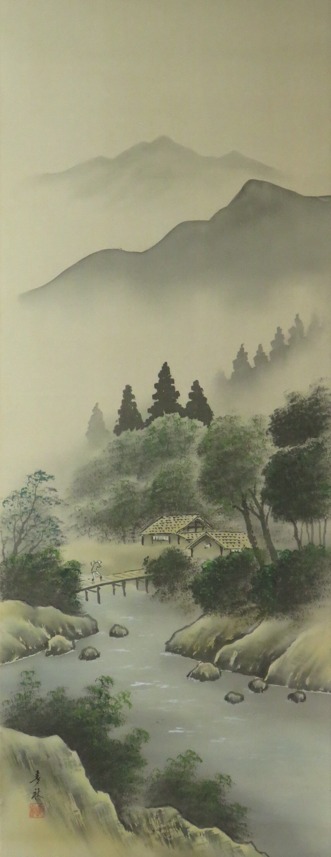 掛軸 平野麦秋 清渓山水(彩色山水) 尺五立 現代作家新作掛軸 JY1902