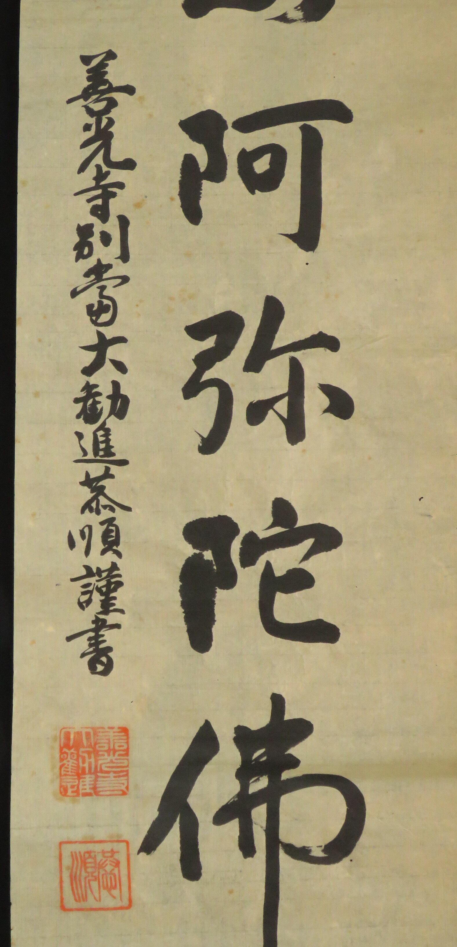 掛軸 メクリ2枚 清水谷恭順(SHIMIZUDANI-Kyojun群馬 1891-1979)善光寺大勧進「南無阿弥陀佛」六字名号「衣和富貴」御染筆 JY1949